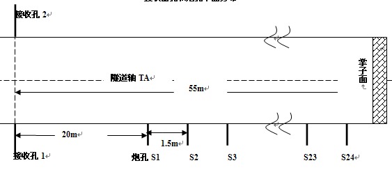 位 置 | 距离掌子面约55m | 第1个炮孔离同侧接收器孔15~20m,炮孔距1.5m左右 | |
