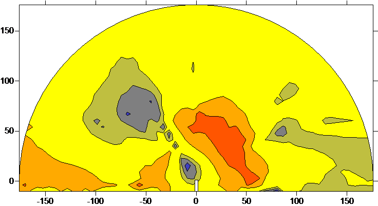 掌子面超前探测共获得实测扇形剖面 3 幅,分别为掌子面前上方 45º仰角探测扇形剖面(顶板)、掌子面前方探测扇形剖面(顺层)、掌子面前下方 45º俯角探测扇形剖面(底板)。图中蓝色区域为低阻异常区,图 4、图 5 低阻异常区各 2处,分列为 1#、2#低阻异常区;图 6 低阻异常区 1 处,为 1#低阻异常区。